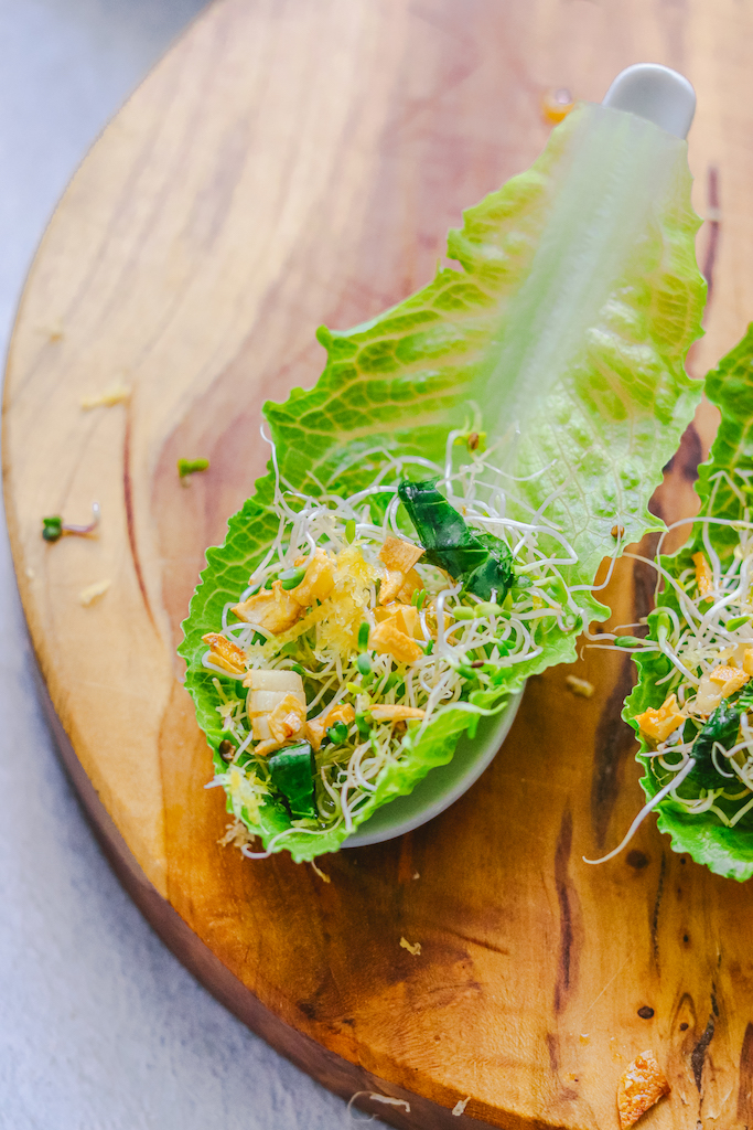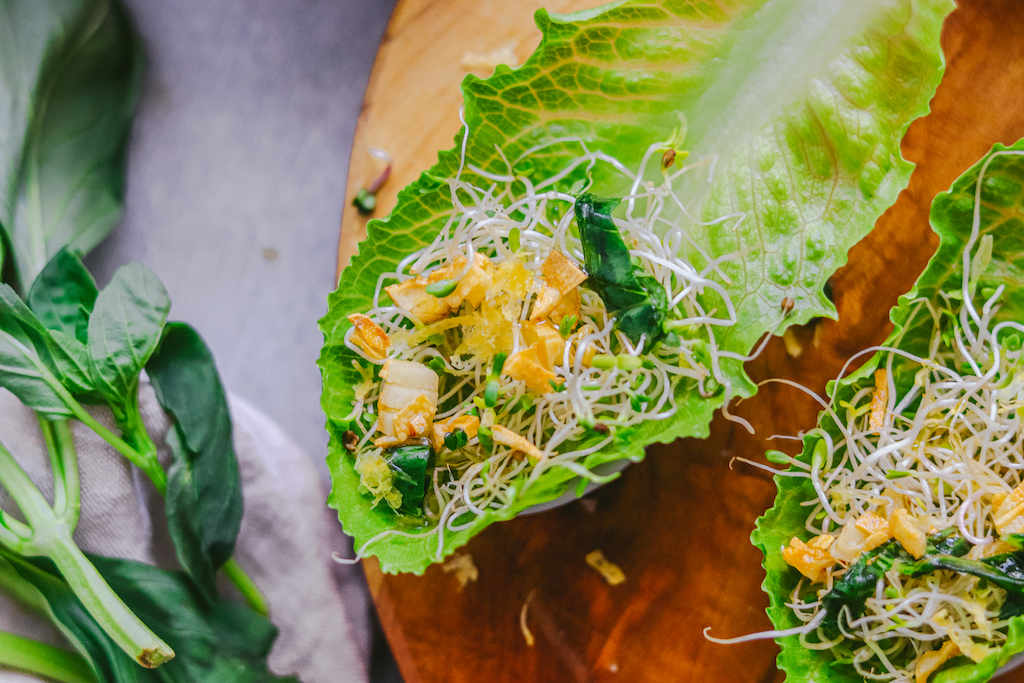 - Détachez des feuilles de Jimbee et lavez-les. Placez-y un fond de graines germées, puis ajoutez l’ail frit à l’aide d’une cuillère et assaisonnez avec la vinaigrette.