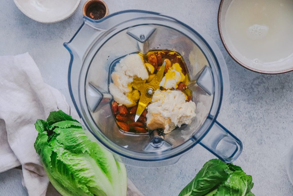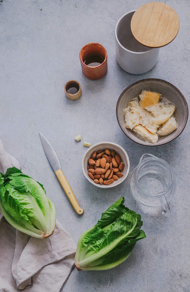 - Faites tremper la mie de pain dans de l’eau froide pendant quelques minutes, jusqu’à ce qu’elle soit bien imbibée. Ensuite, égouttez-la et placez-la dans un mixeur ou un robot avec le reste des ingrédients (excepté l’huile d’olive vierge extra). Mixez bien l’ensemble tout en ajoutant petit à petit l’huile d’olive vierge extra afin de créer une émulsion.