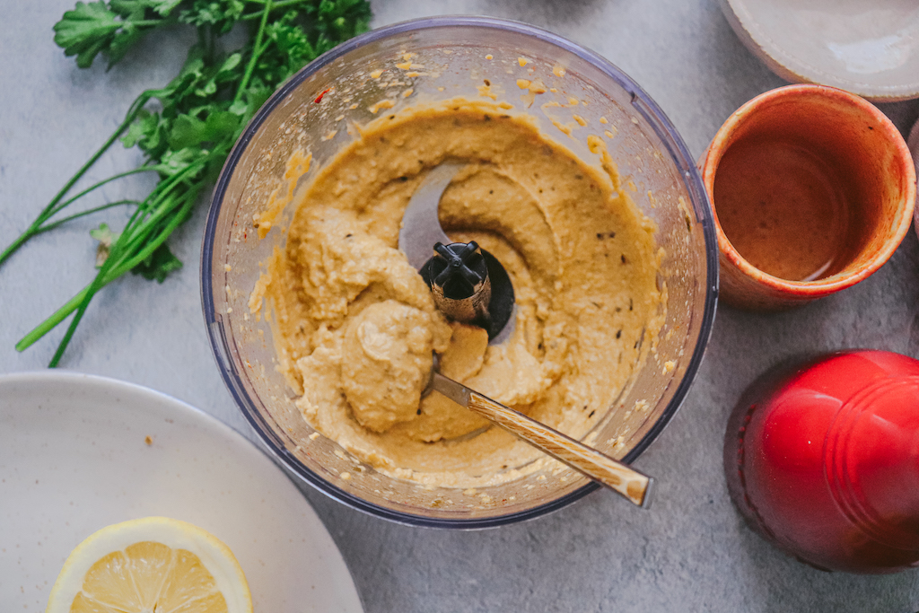 - Dans un mixeur ou un robot, ajoutez tous les ingrédients et mixez jusqu’à l’obtention d’une pâte homogène. Si la texture vous semble trop épaisse, ajoutez un peu d’eau.