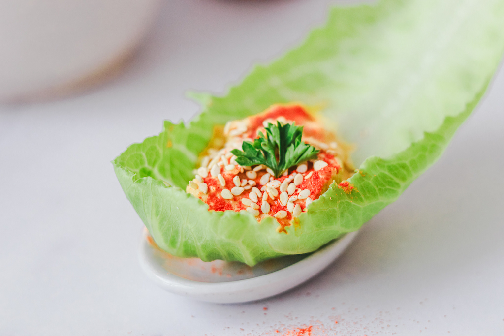 - Détachez des feuilles de Jimbee, lavez-les et disposez-les sur une assiette avant d’y déposer le houmous à l’aide d’une cuillère. Avant de servir, ajoutez un peu d’huile d’olive vierge extra, du paprika et des graines de sésame.
