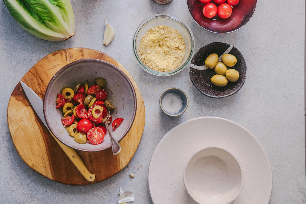 - Lavez les tomates cerises et coupez-les en deux. Émincez les olives et réservez.
