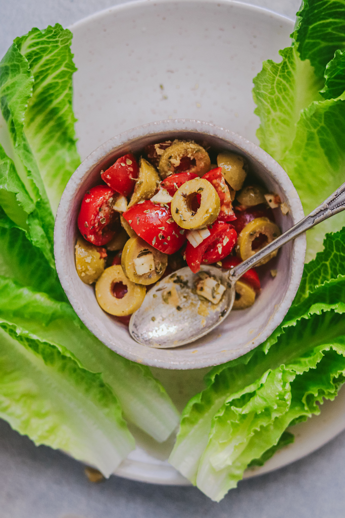 - Détachez des feuilles de Jimbee, lavez-les et disposez-les sur une assiette avec le bol d’antipasti. Prévoyez une cuillère pour le service.