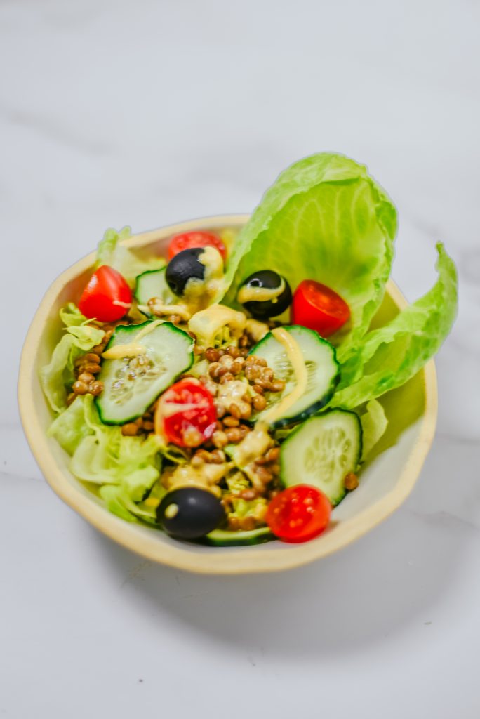 - Sirve la ensalada combinando todos los elementos y añade salsa de mostaza dulce.