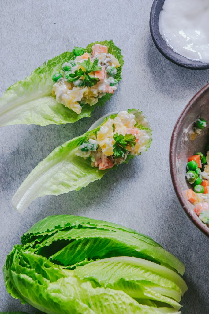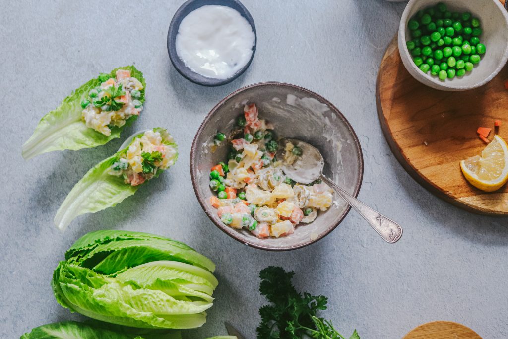 - Sobald die Kartoffeln fertig sind, diese mit etwas kaltem Wasser abschrecken und schälen. Anschließend abkühlen lassen und in Würfel schneiden. Zusammen mit den Erbsen, der Karotte und den Oliven in eine Schüssel geben. Ein paar Esslöffel vegane Mayonnaise hinzugeben und vermengen.