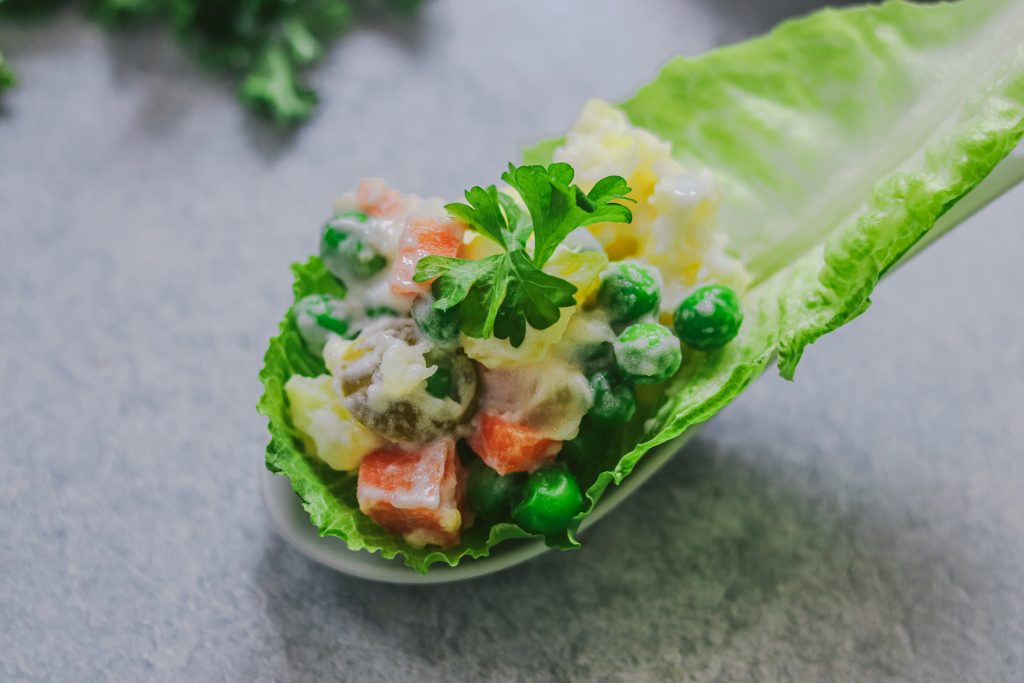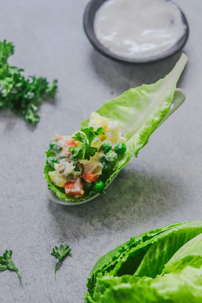 - Den Jimbee entblättern, waschen und die Ensaladilla mithilfe eines Löffels servieren.