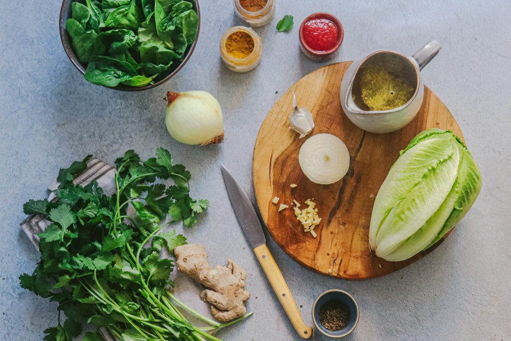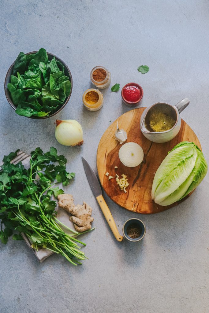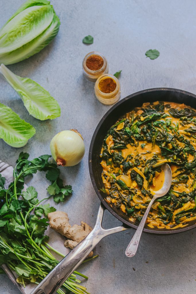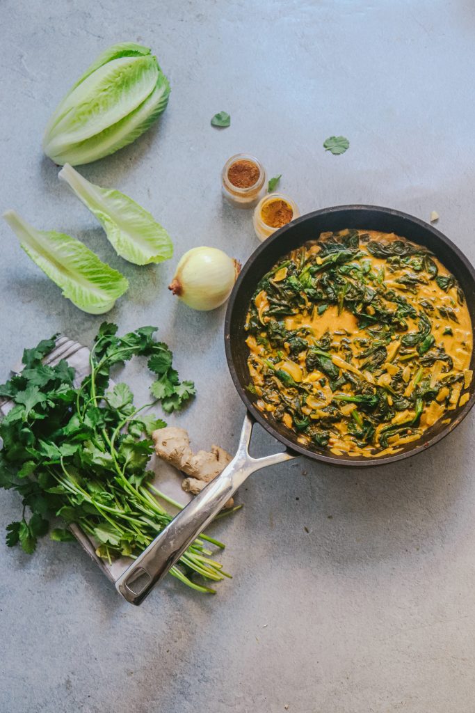 - Nun die Gemüsebrühe sowie die Gewürze und den Koriander zufügen. 10 Minuten kochen lassen und schließlich Kokosmilch oder Kokosjoghurt zufügen.