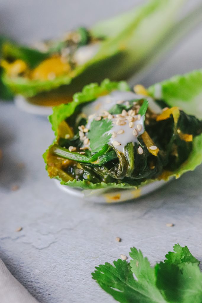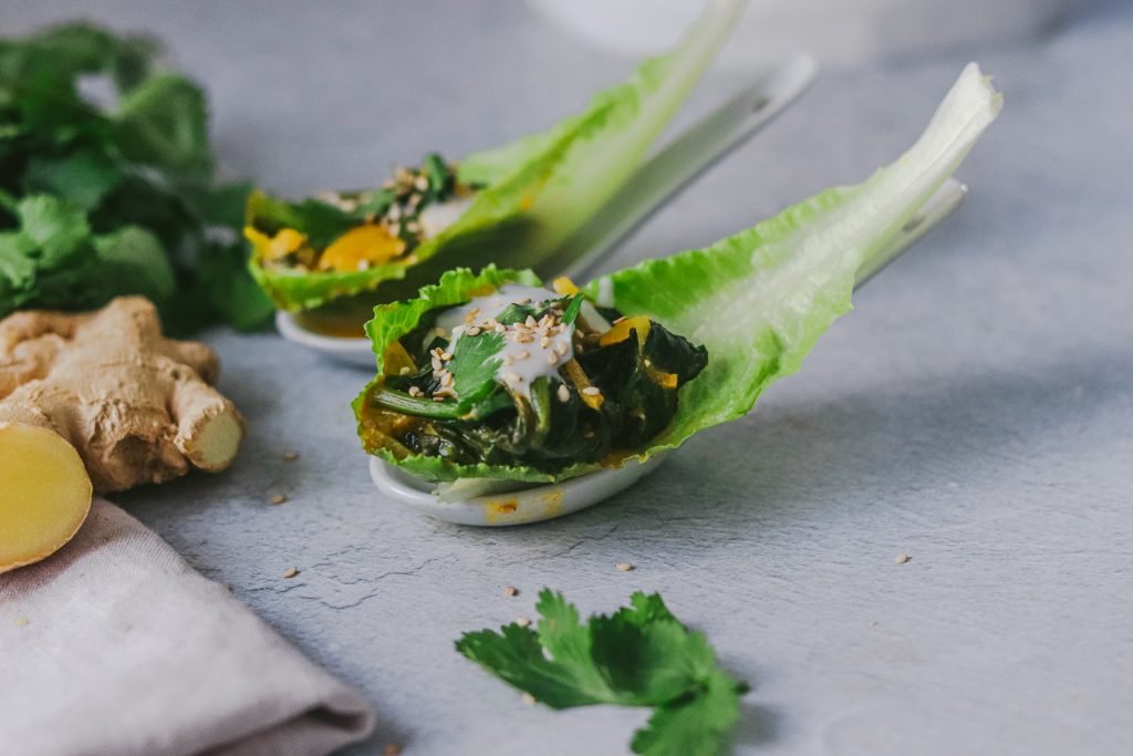 - Den Jimbee entblättern, waschen und das Curry mithilfe eines Löffels servieren. Etwas Kokosjoghurt ohne Zucker zusammen mit Sesamsamen hinzugeben.