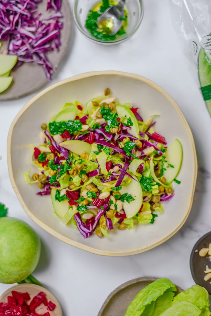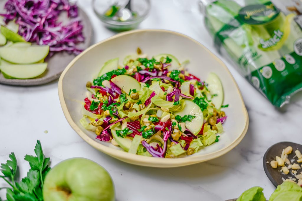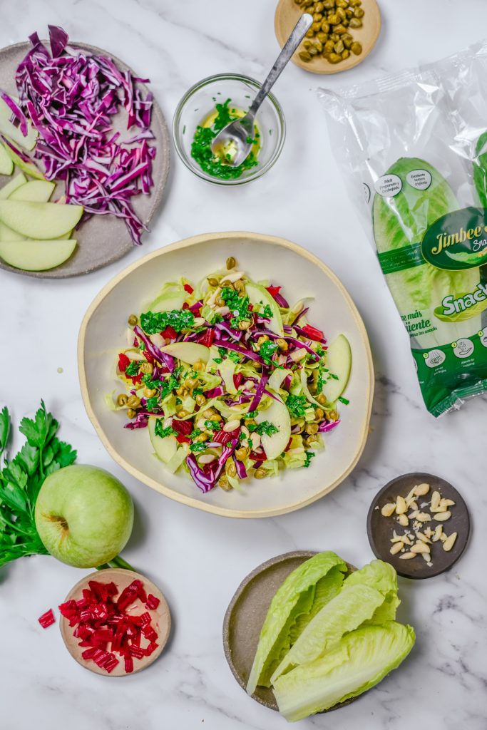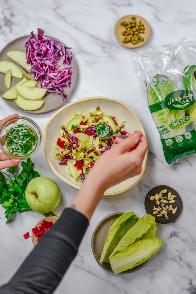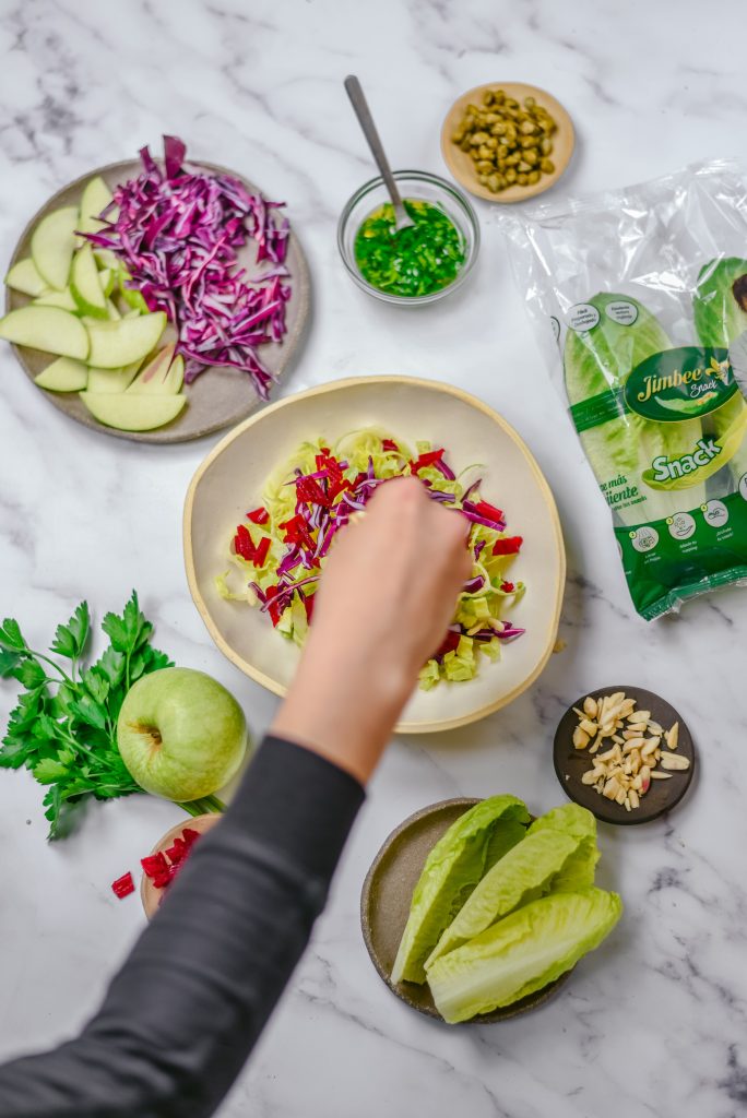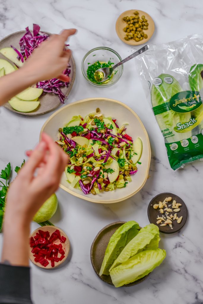• Monta la ensalada combinando todos los elementos. Prepara una base de lechuga Jimbee Snack picada. Corta la manzana en láminas y la lombarda en tiras finas. Añade también la remolacha picada, las alcaparras y las almendras.