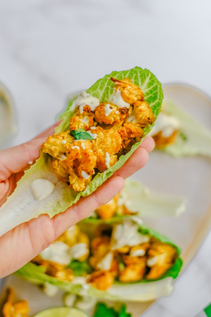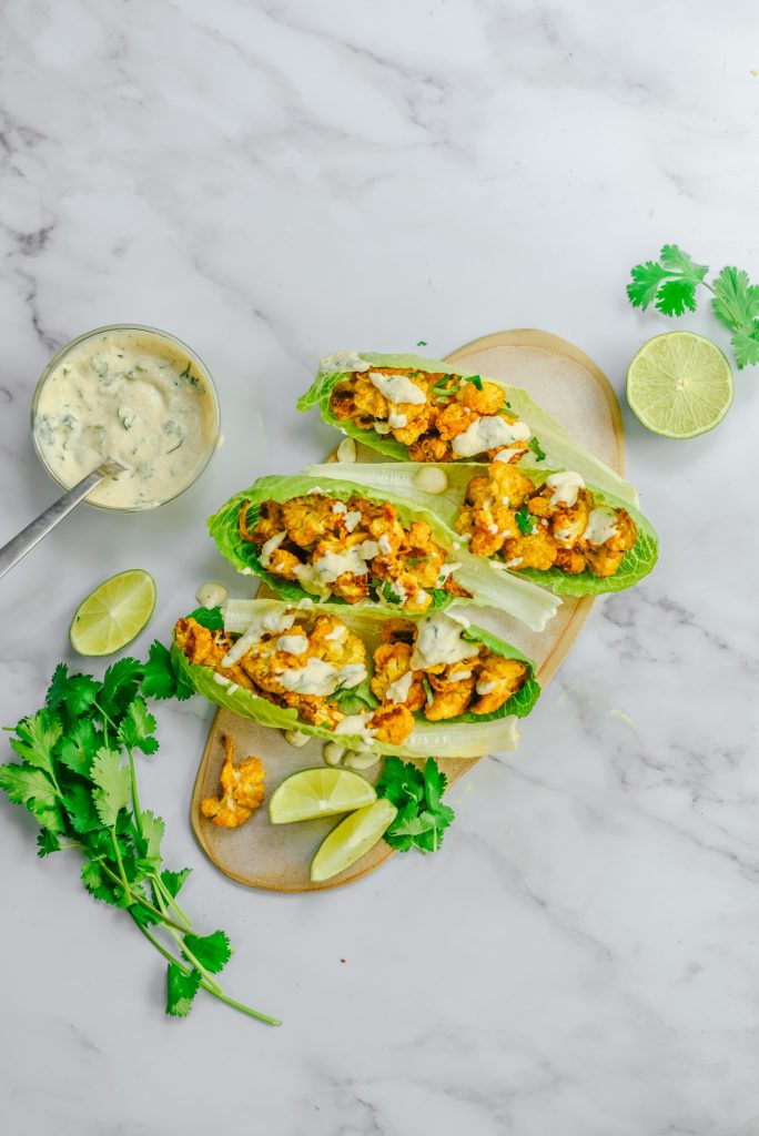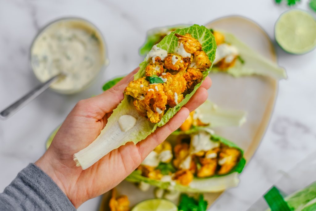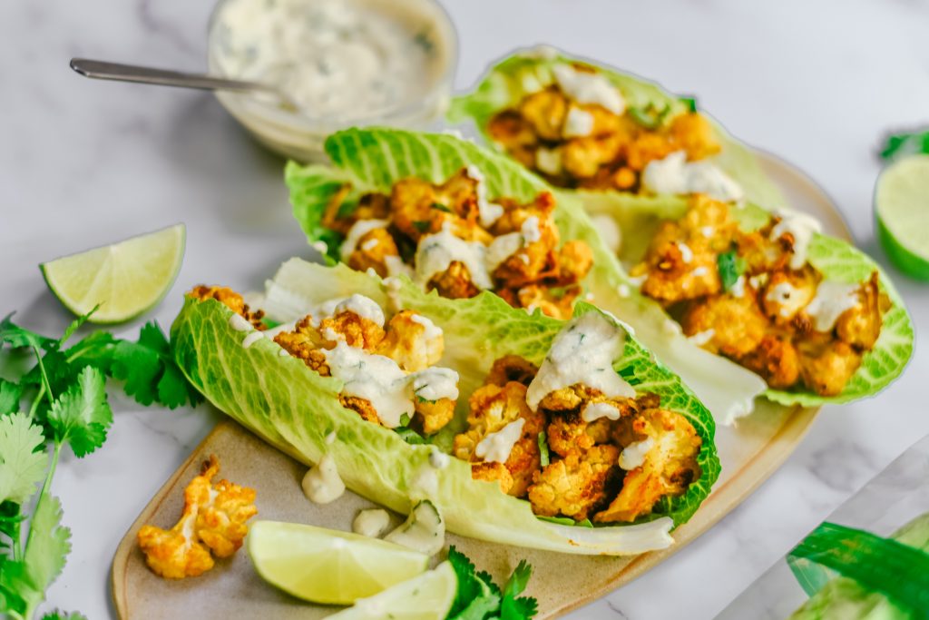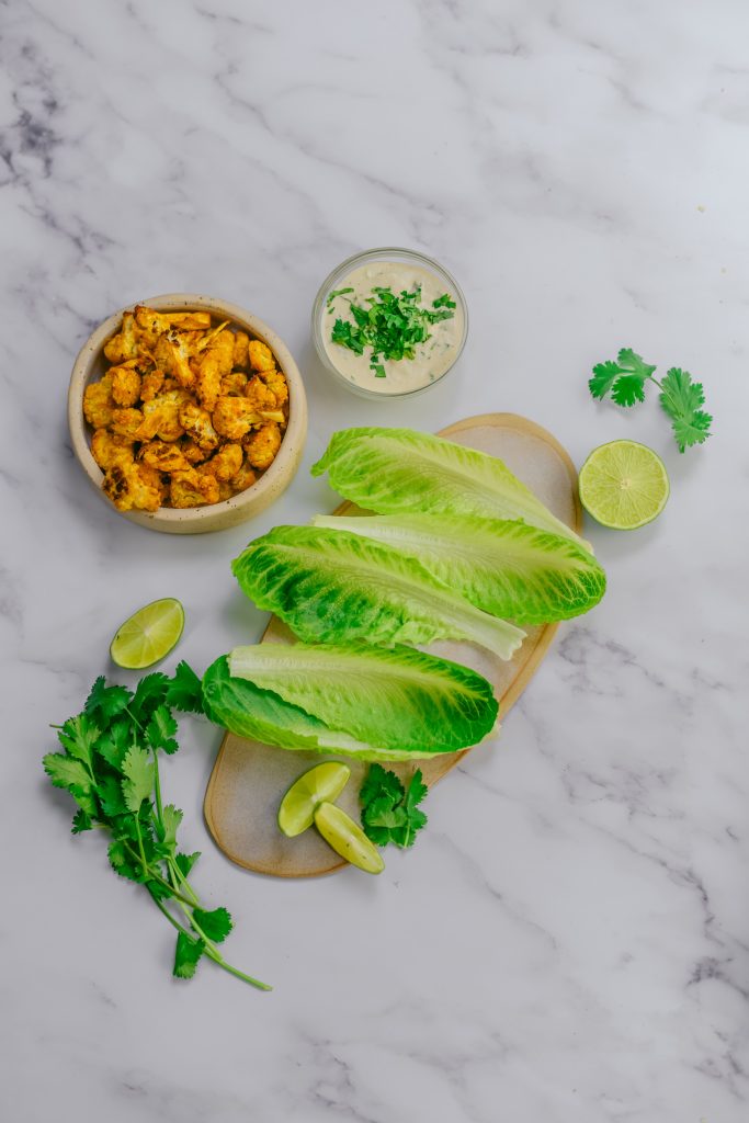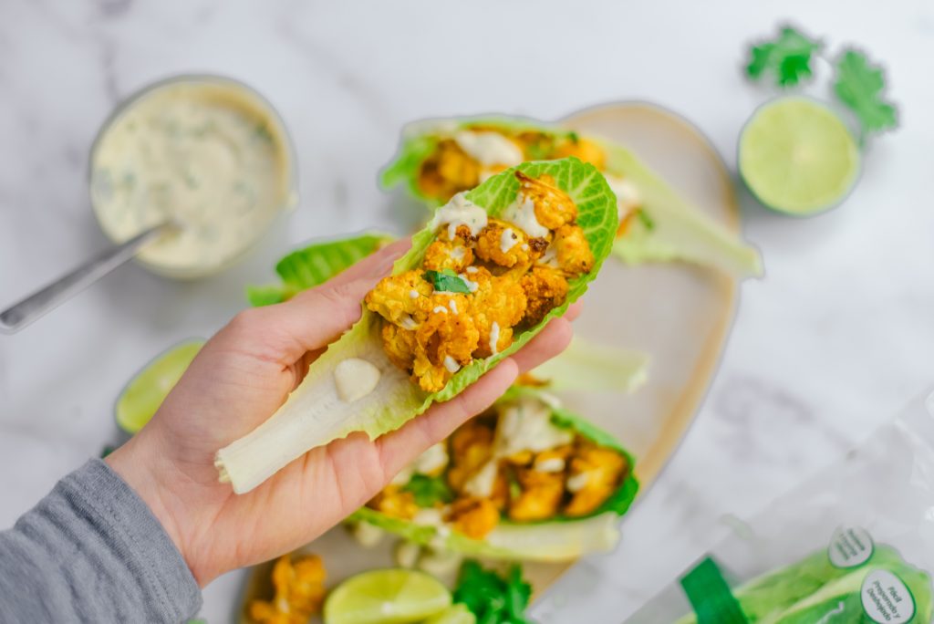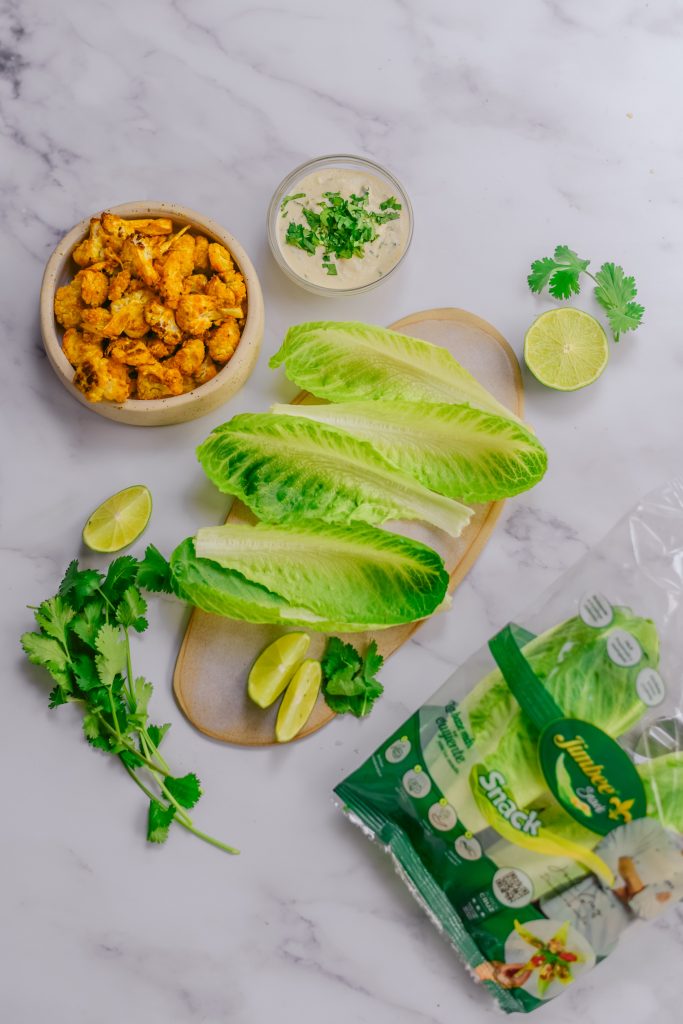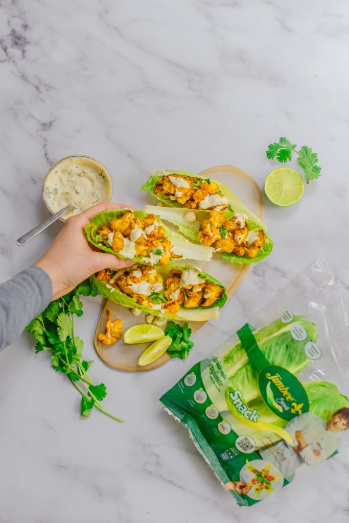 - Sirve los tacos. Separa las hojas de la lechuga Jimbee Snack y rellenalas con la coliflor y la salsa de lima.