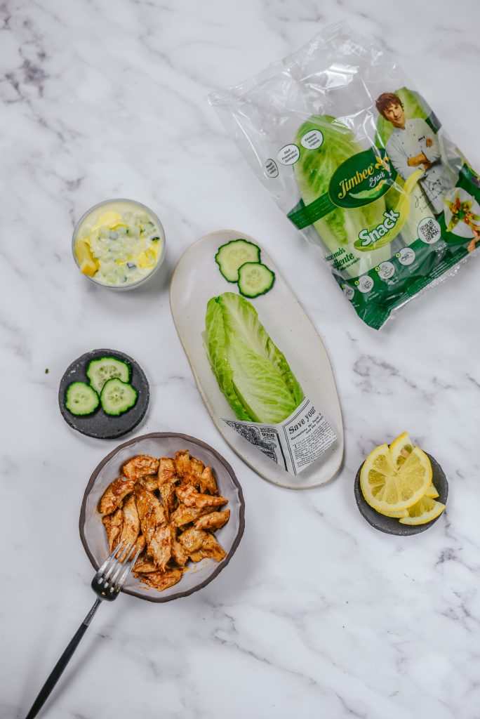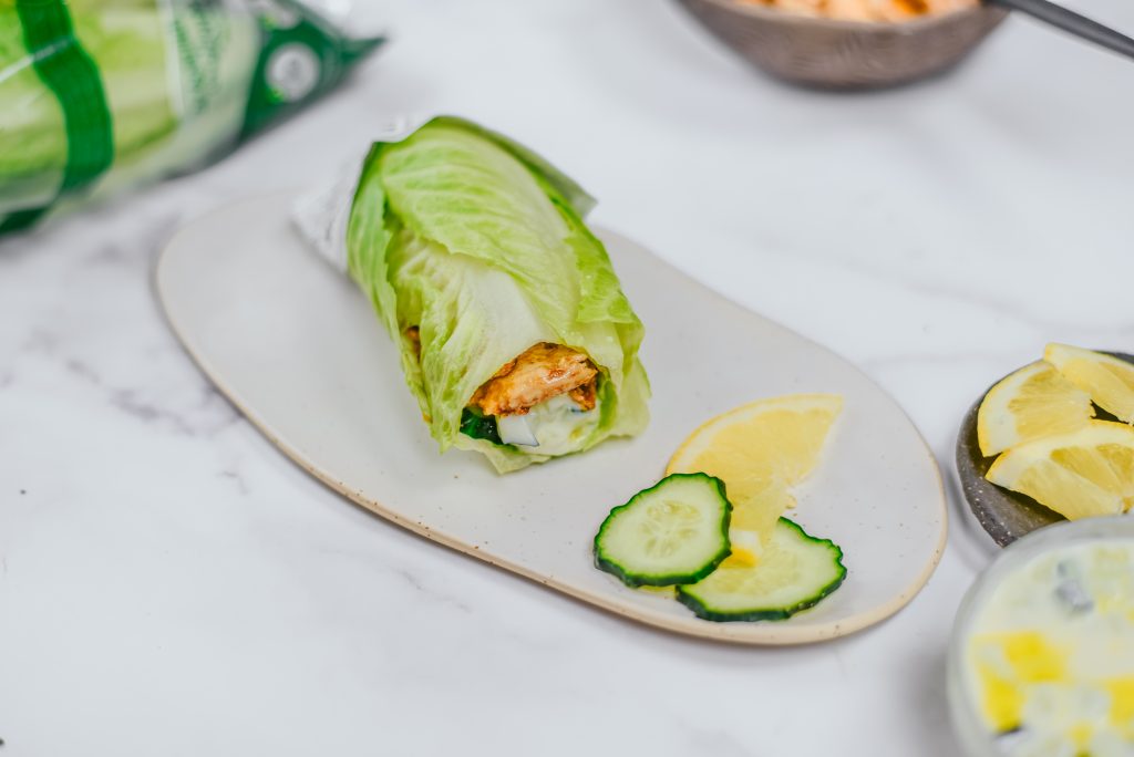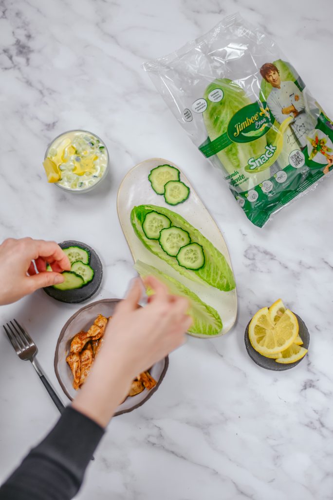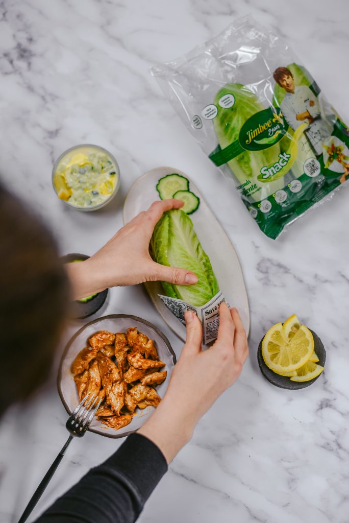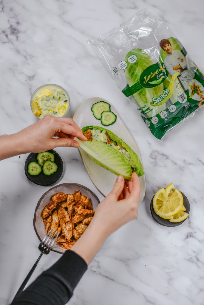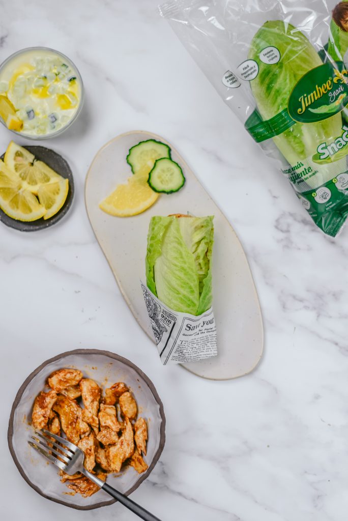 - Monta tu wrap. Selecciona las hojas exteriores de la lechuga Jimbee Snack. Superpón un par y añade la proteína a la barbacoa con la salsa tzatziqui. Cierra con más hojas de lechuga hasta formar el wrap.
