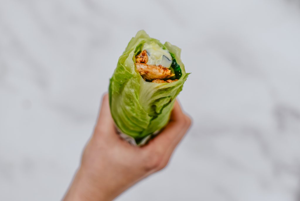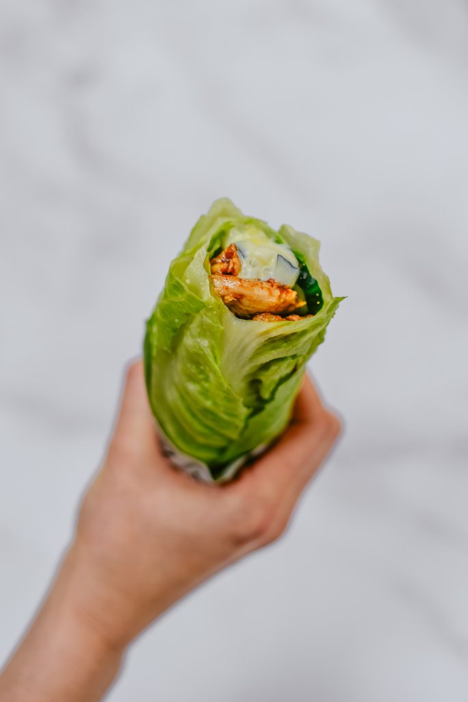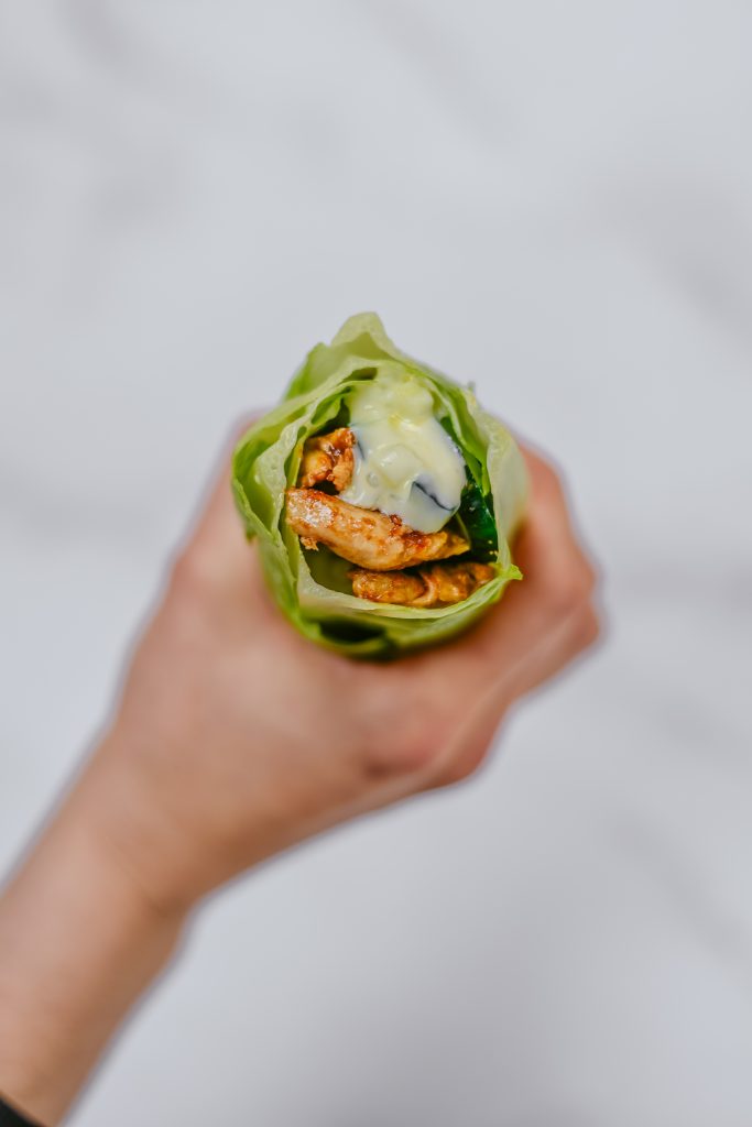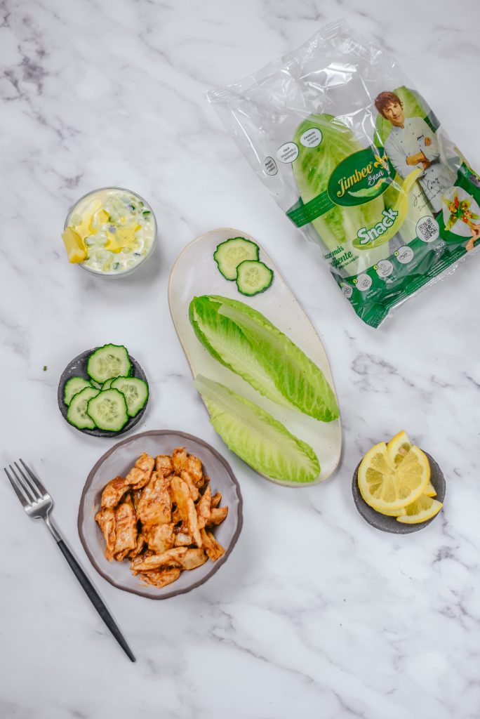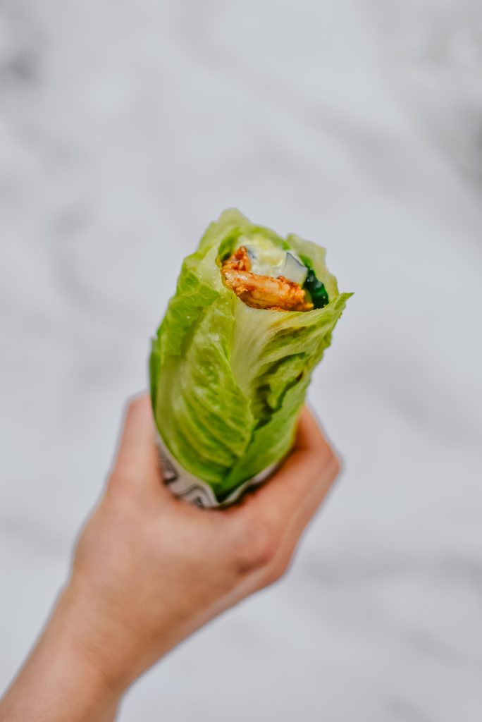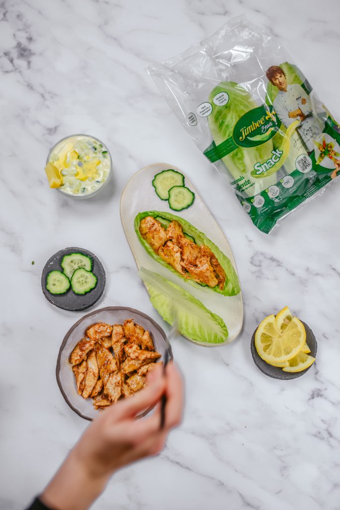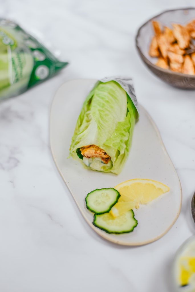 - Monta tu wrap. Selecciona las hojas exteriores de la lechuga Jimbee Snack. Superpón un par y añade la proteína a la barbacoa con la salsa tzatziqui. Cierra con más hojas de lechuga hasta formar el wrap.